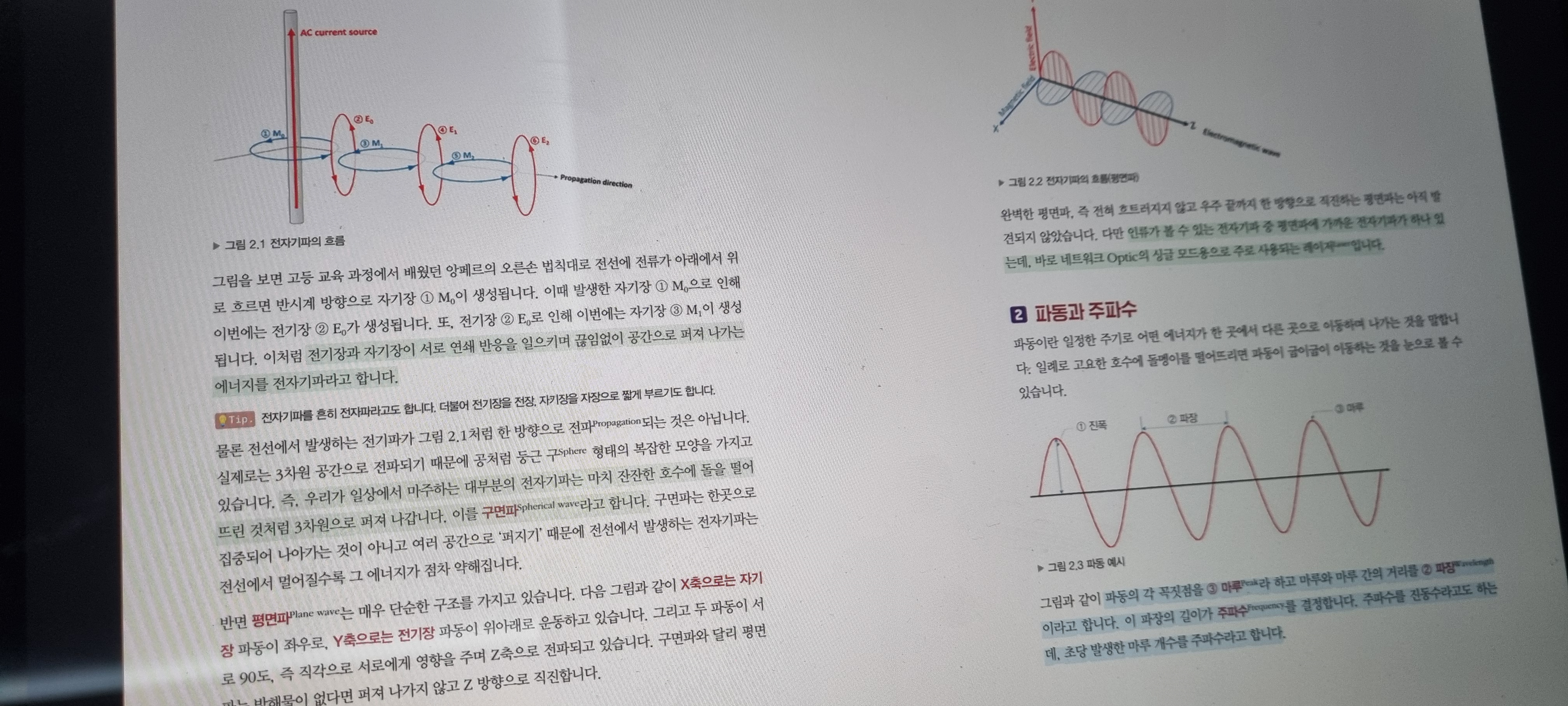 예를 들면 전자기파 설명이 진짜 쫌 놀랬어요. '전기력이랑 자기력 합치면 빛이 된다'는 걸 되게 직관적인 그림으로 보여주는데, 과학 시간에 봤던 그 횡파 그림 있죠? 자기장 파동이랑 전기장 파동이 서로 90도로 흔들리면서 앞으로 가는 모습을 딱! 머리에 쏙 들어오게 설명해줘요. 이렇게 뼈대부터 차근차근 쌓아가니까, 뒤에 나오는 광케이블이나 장비 얘기가 훨씬 실감나더라고요.