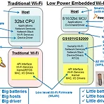 게인스팬 GainSpan 와이파이 솔루션은 단일 칩에 두개의 Cortex M3 Core (코어1개는 와이파이, 다른 1개는 애플리케이션 용) 와 메모리, RTC등을 내장하고 있는 점이 특징이다. 이렇게 코어가 2개인 것의 장점은 기존의 와이파이 솔루션 보다 간편하고 standalone으로 와이파이 구현이 가능하다는 점이다. 또 외부에 8/16비트 MCU를 UART/SPI/SDIO와 같은 serial interface를 통해 연결하면 AT 커맨드를 사용해 원하는 data를 WiFi 망으로 보낼 수 있다. GainSpan WiFi Solution 지금 까지의 와이파이 솔루션은 와이파이 MAC 부분만 올라가 있고 와이파이 MAC 구동용 드라이버와 네트워크 스택, Security 등의 애플리케이션은 호스트 프로..